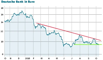Ein Befreiungsschlag wäre ein Anstieg über das jüngste Hoch bei 9,60 Euro. Im Anschluss hätte die Aktie Luft bis 10,50 Euro. Doch dieses Szenario erscheint angesichts der Entwicklungen in Italien und Griechenland - die Anleiherenditen steigen dort bedenklich - unwahrscheinlich.