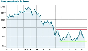 Die Erwartung steigender Zinsen ist zwar gut für die deutschen Großbanken, doch vorerst muss die Schuldenkrise in Italien vom Tisch. Die Commerzbank bleibt auf der Empfehlungsliste mit Stopp bei 7,90 Euro. Die Deutsche Bank ist weiter kein Kauf.