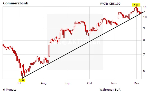 Die Aktie der Deutschen Bank legt am Montagmorgen leicht zu und hält sich über der wichtigen Marke von 34 Euro. Die Aktie ist ein Kauf. Auch die Commerzbank-Aktie verbessert sich leicht. Hier gilt: Commerzbank-Aktionäre lassen die Gewinne laufen und setzen einen engen Stoppkurs.