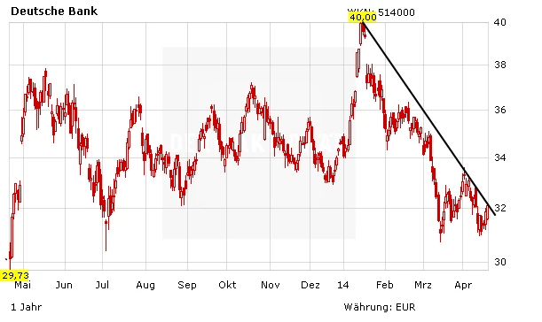 Infolge der positiven Gewinnentwicklung sind die Aktien der US-Banken in den vergangenen Monaten stark gestiegen. Ganz anders als die Deutsche Bank, die im Seitwärtstrend gefangen ist. Laut der Schweizer Großbank UBS hat das Papier kaum noch Potenzial. Analyst Daniele Brupbacher hat den Titel des deutschen Marktführers von „Kaufen“ auf „Neutral“ abgestuft und das Kursziel von 47 auf 33 Euro gesenkt.