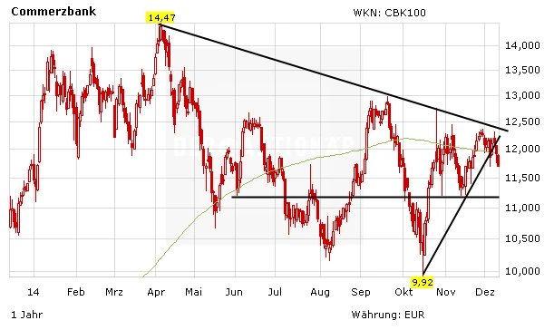 Am Mittag notiert die Commerzbank-Aktie mit 0,4 Prozent im Minus bei 11,77 Euro. Der von Oktober an gültige kurzfristige Aufwärtstrend ist nun nachhaltig gebrochen, vom seit April an intakten Abwärtstrend hat sich der Titel weiter entfernt. Zudem kämpft die Aktie mit der 200-Tage-Linie, die aktuell bei 11,90 Euro verläuft. Ein nachhaltiges Abrutschen unter die Durchschnittslinie wäre ein bearishes Signal.