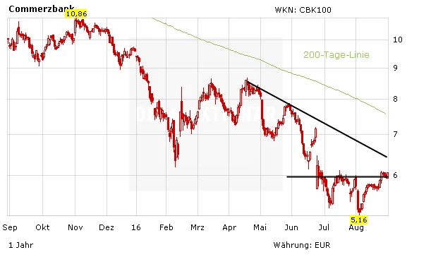 Die Offensive zur Digitalisierung ist endlich ein Hoffnungsschimmer für die Commerzbank-Aktionäre. Um die Bank neu aufzustellen, sollte der Vorstand im Herbst aber weitere Maßnahmen bekannt geben. Denn längst ist der Markt mit Konkurrenten aus der Fintech-Branche besetzt. Mit einem Kurs-Buchwert-Verhältnis von nur noch 0,26 und einem KGV von elf ist die Aktie günstig bewertet. Auch charttechnisch sieht es besser aus. Im freundlichen Gesamtmarkt ist der Titel über den Widerstand bei 6 Euro geklettert. Das nächste Ziel ist der mittelfristige Abwärtstrend bei 6,60 Euro. Trader können auf einen Test setzen, alle anderen bleiben investiert.