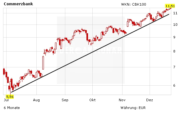 Die Commerzbank-Aktie gewinnt am Freitagmorgen ein Prozent auf 11,52 Euro. Der Aufwärtstrend ist weiter intakt. Commerzbank-Aktionäre lassen die Gewinne laufen und sichern ihre Position mit einem relativ engen Stoppkurs ab.