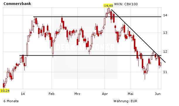Bei der Commerzbank-Aktie gilt es weiterhin, den bedeutenden Widerstand bei 11,80 Euro genau zu beobachten. Solange diese Marke nicht nachhaltig überwunden wird, drängt sich ein Kauf der Commerzbank-Aktie wahrlich nicht auf. Die Aktie fiel jüngst unter den Stoppkurs des AKTIONÄR. Sehr mutige Anleger, die die Kursschwäche zum Einstieg genutzt haben, sollten ihre Position mit einem Stopp knapp unterhalb des Tiefs bei 10,66 Euro absichern.