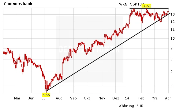 Die Commerzbank-Aktie ist nicht aufzuhalten. Nachdem das Papier mit einem Aufschlag von 1,4 Prozent aus dem Montagshandel gegangen war, legt die Aktie auch im frühen Dienstaghandel zu. Die 14-Euro-Marke ist in Reichweite. Ein Überwinden dieser Marke würde einen Mega-Ausbruch bedeuten.