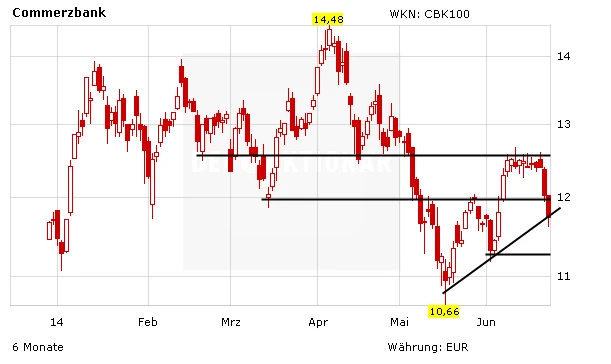 Die Commerzbank-Aktie verliert am Dienstag ein Prozent auf 11,62 Euro. Damit verschlechtert sich das Chartbild weiter. Das nächste Kursziel liegt nun bei 11,185 Euro, dem Zwischentief von Anfang Juni. Sollte die Korrektur auch hier nicht stoppen, könnte das Mehrmonatstief bei 10,66 Euro noch einmal getestet werden. Der Titel fiel vor Kurzem unter den Stopp des AKTIONÄR bei 11,70 Euro. Mit einem Neueinstieg sollte abgewartet werden.