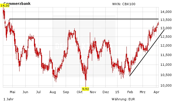 Die Commerzbank ist 2015 gefragt bei den Anlegern. Seit Jahresanfang hat die Aktie von Deutschlands zweitgrößter Privatbank 22 Prozent zugelegt. Der nächste, allerdings nicht besonders bedeutende Widerstand wartet bei 13,58 Euro. Wird er überwunden, ist der Weg bis 14 Euro frei. Der Stopp sollte bei 10,80 Euro gesetzt werden.