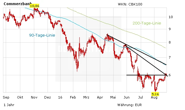 Wie schlimm die Eigenkapitalverschärfung tatsächlich wird, weißt derzeit noch niemand. Die Commerzbank leidet derweil weiter unter der Zinspolitik der EZB. Mit einem Kurs-Buchwert-Verhältnis von nur 0,26 ist der Titel extrem günstig bewertet. Damit sich das Chartbild merklich aufhellt, müsste der Kurs in Richtung des horizontalen Widerstandes bei 6,50 Euro laufen. Dort liegt auch die 90-Tage-Linie. Trader können eine Position aufbauen, investierte Anleger bleiben dabei.