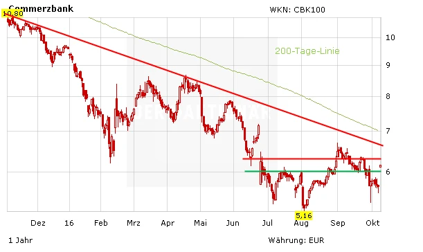 Allen Unkenrufen zum Trotz ist die Commerzbank auf Kurs. CEO Zielke kommt bei der Umsetzung seiner neuen Strategie besser voran als gedacht. Bereits vorbörslich liegt die Commerzbank-Aktie deutlich im Plus. Mit dem Sprung über die 6-Euro-Marke hat sich der Chart zuletzt auch wieder aufgehellt. Mutige können noch Einsteigen. Das Ziel liegt bei 8,00 Euro, ein Stopp bei 5,20 sichert ab.