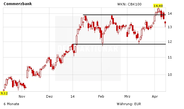 Noch ist nicht aller Tage Abend, die Commerzbank-Aktie bewegt sich weiter in ihrem Seitwärtstrend. Kritisch wird die Situation erst, wenn die Marke von 11,80 Euro unterschritten werden sollte. Bei Kursen oberhalb von 14,00 Euro müssten Anleger wieder auf die Kaufseite wechseln. Aktuell ist die Aktie eine Halteposition.