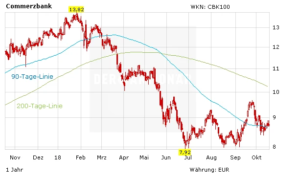Die CoBa-Aktie kann sich heute auf niedrigem Niveau stabilisieren. Es deutet sich eine Bodenbildung an. DER AKTIONÄR bleibt dabei: Wenn eine deutsche Bank, dann die Commerzbank. Sie hat die Chance auf 13 bis 14 Euro - auf Sicht von ein bis zwei Jahren.