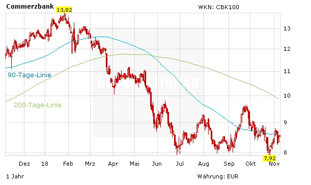 Im dritten Quartal verdiente Bank demnach nur 331 Millionen Euro (Vorjahreszeitraum: 502 Millionen Euro). Unter dem Strich blieben der Commerzbank 218 Millionen Euro, was im Vergleich zum Vorjahresquartal einen Rückgang von 53 Prozent bedeutet. Hier konnten die Frankfurter die Analystenerwartungen ebenfalls leicht übertreffen, die Experten hatten mit einem Überschuss von 211 Millionen Euro gerechnet.