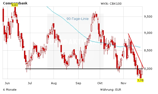 Die Diskussion über Partnerschaften in Teilbereichen über Grenzen hinweg belebt auch die Börsenkurse. Stärker wiegen jedoch die vorsichtigen Entspannungssignale aus Italien, die insgesamt den Bank-Aktien zugute kommen. Die Aktie der Deutschen Bank profitiert heute mit am stärksten. Im DAX gehört sie mit einem Kurszuwachs von über drei Prozent auf 8,50 Euro zu den Tagesgewinnern. Doch auch die CoBank-Aktie entfernt sich etwas von ihren jüngsten Tiefständen. Zeitweise wurde sogar die 8-Euro-Marke erreicht. Dennoch: Beide Aktien hängen noch in ihren Abwärtstrends. DER AKTIONÄR rät weiterhin zum Abwarten.