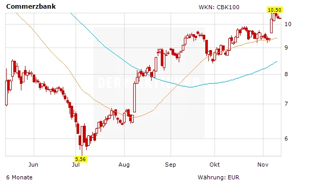 Am Montag hatte die US-Bank Citigroup das Kursziel für die Commerzbank nach den Zahlen zum dritten Quartal von 9,70 auf 10,70 Euro angehoben und die Einstufung auf "Neutral" belassen.