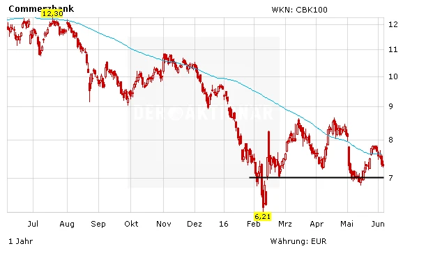 Nach einem ordentlichen Start in die Woche geht es mit der Commerzbank-Aktie am Nachmittag abwärts. Damit trübt sich die charttechnische Situation ein. Die Aktie ist unter die 90-Tage-Linie gerutscht und nimmt langsam Kurs auf die Unterstützungszone im Bereich sieben Euro. Diese Marke ist immens wichtig, denn hält sie nicht, droht schnell ein Test des Mehr-Jahres-Tiefs bei 6,21 Euro.