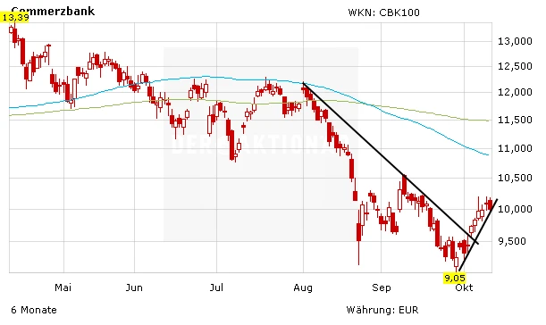 Die weitere Entwicklung der Commerzbank-Aktie hängt in den kommenden Wochen von der Entwicklung des Gesamtmarktes ab. Nachrichtenmäßig wird es seitens der Commerzbank erst in drei Wochen wieder interessant. Am 2. November legt die Bank ihre Zahlen für das dritte Quartal vor.