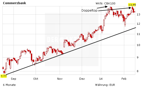 Commerzbank-Aktionäre sollten derzeit den Chart von Deutschlands zweitgrößter Bank genau im Blick haben. Da es in den vergangenen Tagen kein neues Hoch gegeben hat, hat der Chart ein Doppeltop ausgebildet. Dieses könnte zu einem kniffligen Widerstand werden. Sollte er allerdings überwunden werden, sind schnell Kurse um 14 Euro drin.
