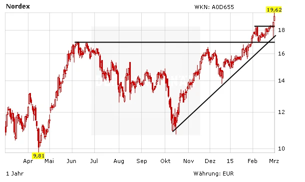 Das ursprüngliche und dann unter Beobachtung gestellte Kursziel hatte bei 17 Euro gelegen. Analyst Sebastian Growe erklärte, Nordex habe gemischte Resultate für das vierte Quartal 2014 vorgelegt. Angesichts einer starken Nachfrage hob er aber seine operativen Ergebnisschätzungen (EBIT) an. Selbst nach der Kursrallye sei es für einen Ausstieg aus der Aktie seiner Meinung nach noch zu früh.