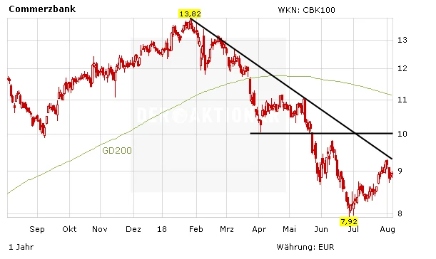 Die Aktie der Commerzbank ist nach dem Rutsch im März dieses Jahres unter die 200-Tage-Linie klar angeschlagen. Daran ändert auch das heutige Kursplus im Zuge des Quartalsberichts wenig. Erst ein Sprung über die 10-Euro-Marke und anschließend eine Rückeroberung der 200-Tage-Linie würde das charttechnische Bild aufhellen. Den Wert belastet zudem das wohl bevorstehende Indexkarussell. Hier wird sehr wahrscheinlich im September der Zahlungsabwickler Wirecard in den DAX aufsteigen. Die Commerzbank wird wohl den Platz dafür räumen müssen und in den MDAX absteigen.