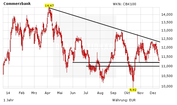 Die Commerzbank-Aktie lässt am Montag weiter Federn. Im frühen Handel verliert das Papier 0,3 Prozent auf 11,32 Euro. Am Freitag hatte der Titel bereits 2,4 Prozent verloren. Die charttechnische Situation spitzt sich damit weiter zu. Kurzfristig droht ein Fall in den Bereich 11,20 Euro. Sollte diese Marke nicht halten, sind Kurse um 10,90 Euro wahrscheinlich. DER AKTIONÄR sieht die aktuelle Kursschwäche als Kaufchance für Mutige. Der Titel hat gute Chancen, 2015 eine Aufholjagd zu starten. Warum die Aktie sogar 18,80 Euro wert ist, erklärt Metzler-Analyst Gudio Hoymann in der aktuellen Ausgabe des AKTIONÄR – entweder hier als ePaper oder am Mittwoch am Kiosk.