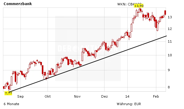Die Mega-Bullen kommen aus den USA. Merrill-Lynch-Analyst Johan Ekblom hat das Kursziel deutlich von 14,30 auf 17,00 Euro erhöht und die Kaufempfehlung bestätigt. Mit der gestärkten Kapitalausstattung und den sinkenden Altlasten sorge die Commerzbank nach Meinung Ekbloms noch immer für positive Überraschungen.