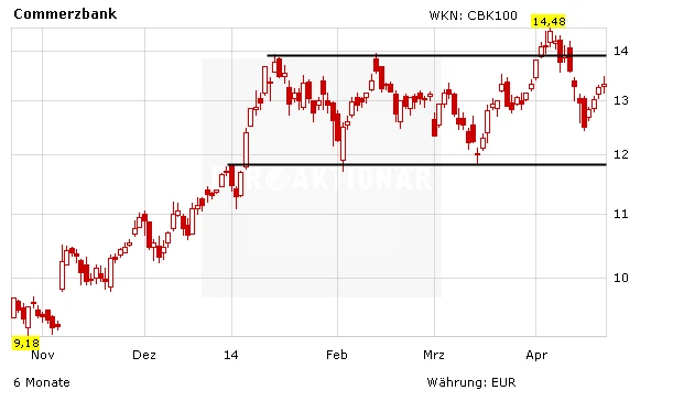 Die Korrektur ist vorbei: Die Commerzbank-Aktie setzt ihre Erholung auch am Donnerstag fort. Der Titel nähert sich dem wichtigen Widerstand im Bereich 14 Euro. Sollte diese Hürde genommen werden, dürfte die Aktie bald deutlich höher notieren. Hans A. Bernecker sieht reichlich Potenzial.