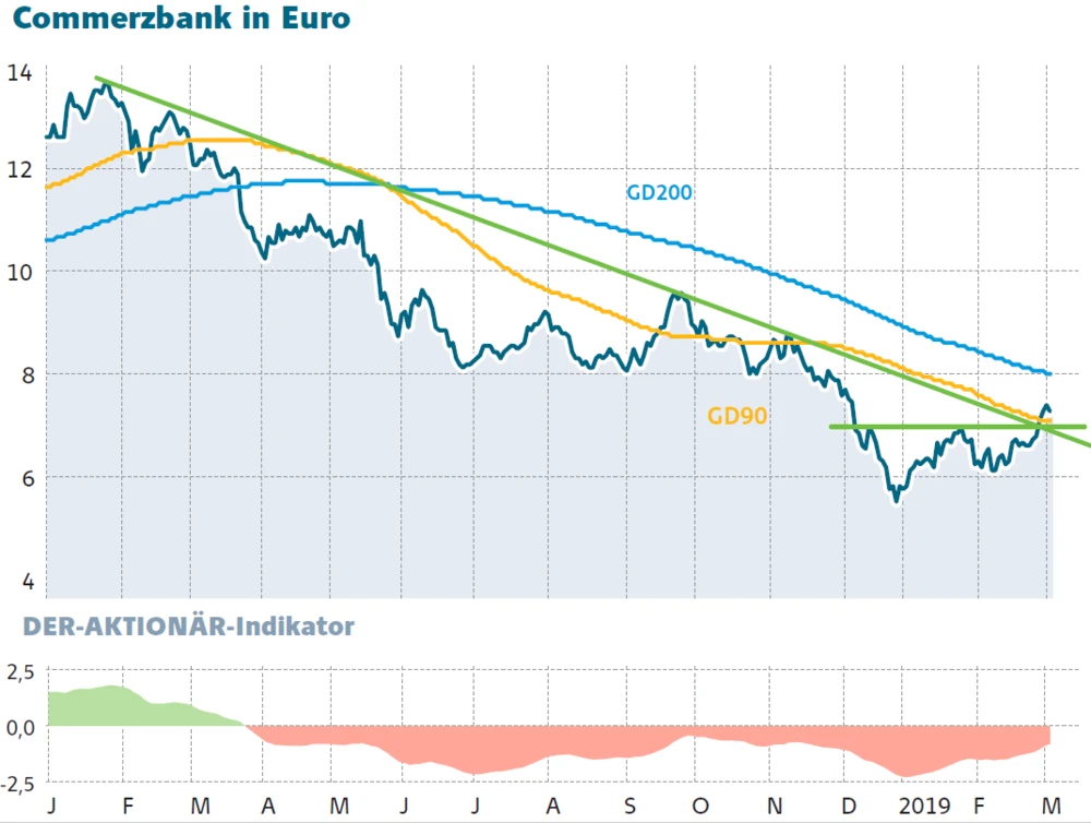 Im überwiegend freundlichen Gesamtmarkt zählt die CoBa-Aktie am Montag zu den Verlierern. Das Minus von knapp einem Prozent kann die jüngsten Fortschritte im Chartbild jedoch kaum trüben. Der Kurs notiert nach wie vor oberhalb der 90-Tage-Linie, die aktuell bei 7,07 Euro verläuft. Sollte er doch wieder unter die Trendlinie zurückfallen, wartet im Bereich von sieben Euro bereits eine horizontale Unterstützung.