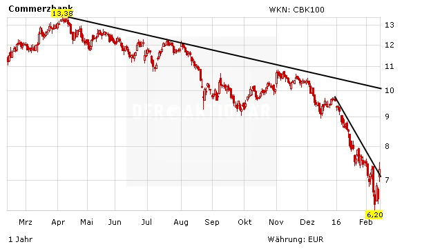 Besonders bullish bleibt das Bankhaus Lampe. Analyst Neil Smith hat die Commerzbank auf „Kaufen“ mit einem Kursziel von zwölf Euro bestätigt. Das Vorsteuerergebnis der Bank habe im vierten Quartal die Konsensschätzung übertroffen. Zudem habe der DAX-Konzern mit Blick auf die interne „Bad Bank“ die Ziele bereits ein Jahr früher als angekündigt erreicht und diese inzwischen weitgehend aufgelöst.