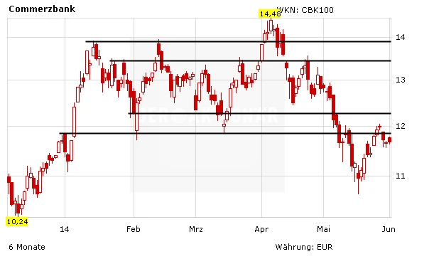 Die Commerzbank-Aktie kämpft nach wie vor mit dem markanten Widerstand bei 11,80 Euro. Nach Einschätzung der Analysten hat die Commerzbank-Aktie nicht mehr allzu viel Potenzial. Das durchschnittliche Kursziel lautet 12,86 Euro. 19 von 38 Experten sehen in dem Papier lediglich eine Halte-Position. Neun Analysten sagen „Kaufen“, neun „Verkaufen“.