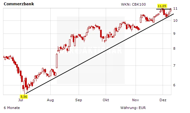 Die Commerzbank-Aktie hat zur Stärke der vergangenen Monate zurückgefunden. Am Dienstag klettert der Titel über drei Prozent und notiert wieder über elf Euro.