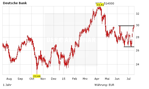 Die Nachricht kann die Deutsche-Bank-Aktie nicht bremsen, am Donnerstagmittag liegt der Titel mit 1,4 Prozent im Plus. Wenn Griechenland im Euro bleibt, sollte die Aktie schnell das Hoch vom April bei 33,42 Euro in Angriff nehmen. DER AKTIONÄR sieht den fairen Wert der Aktie bei 40 Euro, der Stopp sollte bei 24,50 Euro platziert werden. Eine aktuelle Einschätzung zur Commerzbank-Aktie lesen Sie hier.