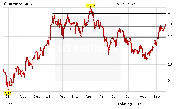DER AKTIONÄR sieht noch Potenzial bei der Commerzbank. Charttechnisch winkt der Ausbruch, zudem sichert die Übernahmefantasie den Kurs nach unten gut ab. Das Kursziel liegt bei 14,00 Euro. Investierte Anleger lassen die Gewinne laufen. Ein zügiger Sprung nach oben ist durchaus möglich.