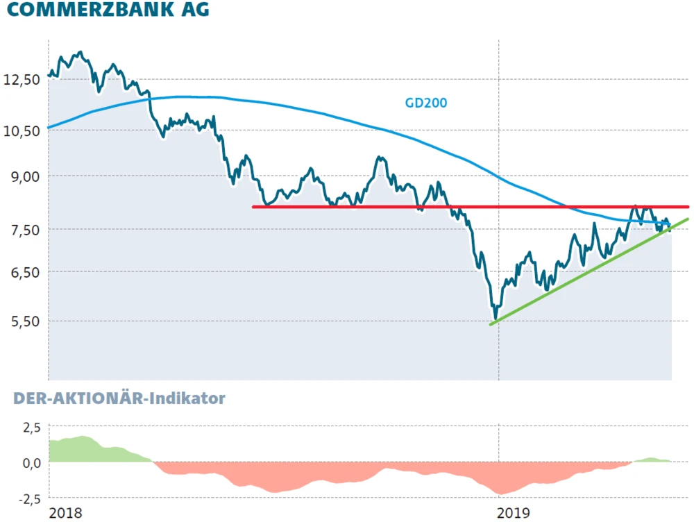 Mit einem Minus von knapp drei Prozent nähert sich die Commerzbank-Aktie am Montagvormittag dem neuen Kursziel der UBS an. Der seit Jahreswechsel gültige Aufwärtstrend gerät damit erneut in aktute Gefahr. DER AKTIONÄR hält aber zunächst noch an seiner Trading-Empfehlung fest und spekuliert auf positive Impulse im weiteren Wochenverlauf.