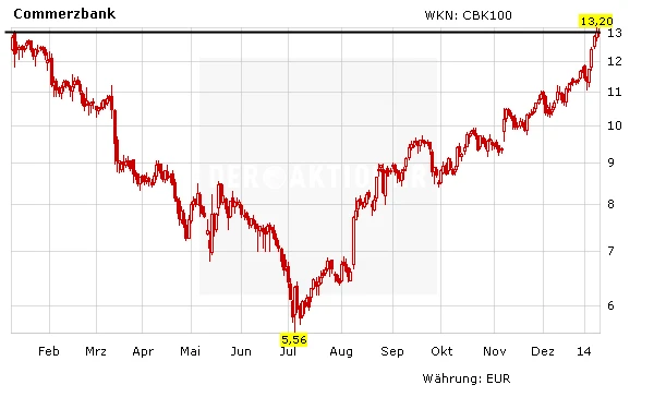Die Commerzbank-Aktie kennt kein Halten mehr. Am Freitag klettert die Aktie über die Marke von 13 Euro. Dort stand der Titel das letzte Mal vor fast genau einem Jahr. Guido Hoymann vom Bankhaus Metzler sieht das Ende der Fahnenstange noch lange nicht erreicht.