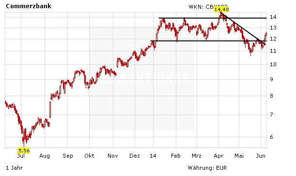 Nachdem die Commerzbank-Aktie am Montag mit einem Plus von 1,7 Prozent aus dem Handel gegangen war, notiert das Papier im frühen Dienstaghandel nahezu unverändert bei 12,49 Euro. Damit ist der Ausbruch über den Widerstand bei zwölf Euro gelungen. Nun rückt die Marke von 13,95 Euro in den Fokus. Hier verläuft der nächste markante Widerstand.