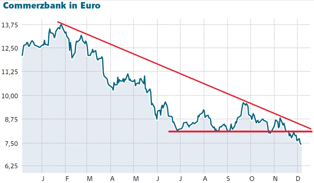 Im schwachen Gesamtmarkt setzt sich die Talfahrt der CoBa-Aktie am Donnerstagmorgen fort. Mit einem Minus von über zwei Prozent gehört sie nicht nur zu den größten Verlierern im MDAX. Auf eine Erholung des trüben Chartbilds warten Anleger damit weiterhin vergeblich. Ein Einstieg bietet sich daher allenfalls auf der Short-Seite an.