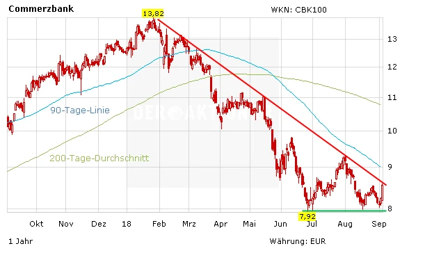 Tatsächlich zeigt ein Blick auf den Jahres-Chart der Commerzbank die wahrscheinlichste Begründung für den aktuellen Kurssprung: Die technische Unterstützung bei knapp 8 Euro konnte einmal mehr verteidigt werden. Und bei 8,65 Euro verläuft die seit Januar intakte Abwärtstrendlinie. Wird sie überwunden, könnten Anschlusskäufe die CBK-Aktie auch schnell bis 9,30 Euro - dem Zwischenhoch von Anfang August - treiben. Damit wäre auch die 200-Tage-Linie überwunden, eine Trend-Umkehr-Formation könnte sich bilden.