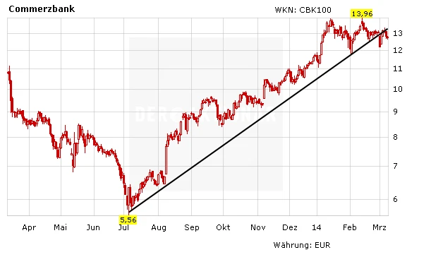 Die charttechnische Situation bei der Commerzbank bleibt kritisch. Die Aktie muss in den kommenden Tagen wieder in den Bereich 13 Euro steigen, damit der seit Juli gültige Aufwärtstrend weiter Bestand hat.