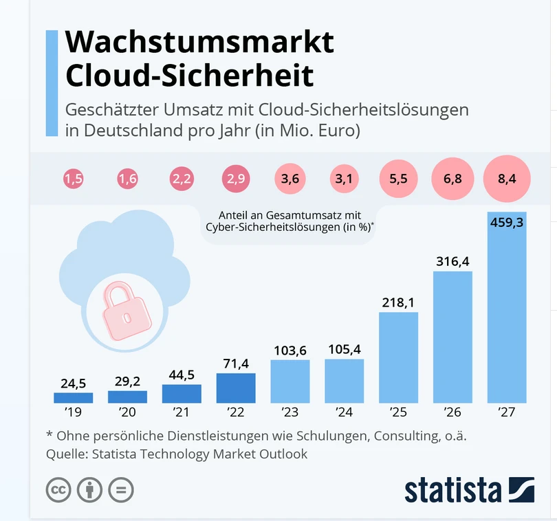 Obige Graphik verdeutlicht den Megatrend zu Cloud-Sicherheitslösungen. Laut Statista wird sich der Umsatz mit Cloud-Sicherheitslösungen alleine in Deutschland von heute aus bis zum Jahr 2027 nahezu versiebenfachen. Davon sollten die Unternehmen aus dem DER AKTIONÄR Cybersecurity Index profitieren. Mit dem Indexzertifikat WKN DA0AB8 können Anleger nahezu 1:1 an der Entwicklung des Index teilhaben.