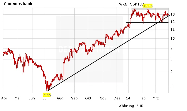 Bei der Commerzbank ergibt sich folgendes Bild: Der Aufwärtstrend der Commerzbank-Aktie ist weiter intakt. Falls es dem Titel gelingt, den markanten Widerstand bei 14 Euro zu überwinden, bedeutete dies ein glasklares Kaufsignal. Dann sollte die Aktie schon bald Kurs nehmen Richtung alte Hochs bei 16 bis 16,50 Euro. Investierte Anleger bleiben dabei und setzen den Stopp bei 11,50 Euro.