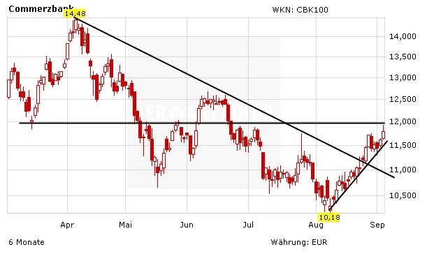 Vor der Pressekonferenz mit EZB-Chef Mario Draghi um 14:30 Uhr legten einige Aktien, darunter die Bank-Aktien, den Turbo ein. Die Commerzbank-Aktie kletterte 2,7 Prozent auf 12,12 Euro, die Aktie der Deutschen Bank verbesserte sich um 0,5 Prozent auf 26,79. Damit hat die Aufwärtsbewegung bei den Titeln weitere Dynamik gewonnen, das Chartbild verbessert sich weiter.