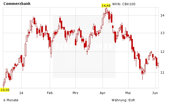 Finanzwerte avancierten vorübergehend europaweit zu den Favoriten der Anleger, kamen dann mit dem Markt aber wieder etwas zurück. Die Commerzbank profitierte nicht nur von den zusätzlichen Liquiditätsmaßnahmen der Währungshüter, sondern auch von neuen Übernahmefantasien. Einem Bericht zufolge prüfen sowohl die französische Bank Societe Generale als auch die spanische Santander ein Bündnis mit dem Institut. Mit einem Plus von 3,19 Prozent auf 11,81 Euro lag die Commerzbank-Aktie am Ende des Handelstages am Donnerstag klar an der DAX-Spitze. Noch hat der Wert aber kein Kaufsignal generiert. Erst ein nachhaltiger Sprung über die jüngsten Hochpunkte und damit die 12-Euro-Marke würde das charttechnische Bild aufhellen.