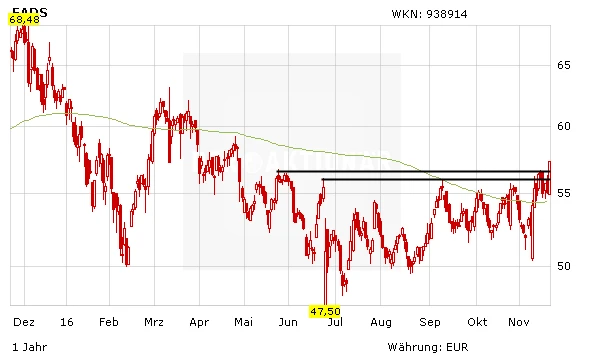 Die Aktie der Airbus Group kann im heutigen Handel kräftig zulegen. Denn dem Kurs hat nun endlich den hartnäckigen Widerstandsbereich bei 56,00 und 56,80 Euro überwinden können und damit ein neues Kaufsignal generiert. Rückenwind erhielten die MDAX-Titel dabei auch durch einen positiven der Commerzbank.