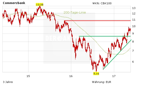 Die Aktie ist mit einem KGV von 20 hoch bewertet. Allerdings soll das KGV schon im kommenden Jahr auf 14 fallen. Das Kurs-Buchwert-Verhältnis von 0,4 spricht zudem für eine Unterbewertung der Commerzbank. Der AKTIONÄR hält die Aktie vor allem wegen der Fantasie einer Zinswende in Europa ab dem Jahr 2018 für kaufenswert. Das Ziel beträgt 12,50 Euro. Anleger setzen einen Stoppkurs um 7,00 Euro.