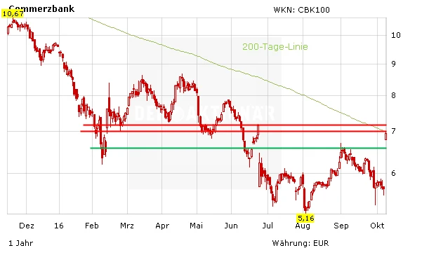 Durch die Börsenrallye nach dem Sieg von Donald Trump bei den amerikanischen Wahlen hat auch die Commerzbank-Aktie wieder Schwung bekommen. Die Zahlen zum dritten Quartal fielen bei dem Geldhaus weniger schlimm aus als Experten erwartet hatten. Der Kauf der OLB könnte für den Konzernumbau indes ein sinnvoller Baustein sein. Mutige können bei der Aktie weiter zugreifen, der AKTIONAER sieht ein Kursziel von 8,00 Euro. Der Stopp sollte bei 5,20 Euro gesetzt werden.