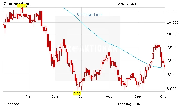Anleger, die dem spekulativen Tipp von DER AKTIONÄR aus der vergangenen Woche folgten und sich ein paar erste Commerzbank-Stücke zulegten, bleiben hier mit engem Stopp dabei. Die zunächst genannten 8,50 Euro erscheinen angesichts der hohen Volatilität zu eng, besser ist eine Stopp-Loss-Marke knapp unter den bisherigen Tiefstkursen bei 7,90 Euro. Ganz Mutige kaufen auf dem aktuellen Niveau ein paar Stücke nach.