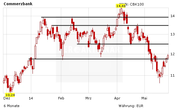 Auf seinem Weg Richtung 10.000 nimmt der DAX die Commerzbank-Aktie mit. Deutschlands heißeste Bank-Aktie kratzt am Mittwochmorgen an der 12-Euro-Marke. Damit hat sich der Titel in die monatelang gültige Seitwärtsrange zurückgekämpft. Doch hält die Unterstützung?