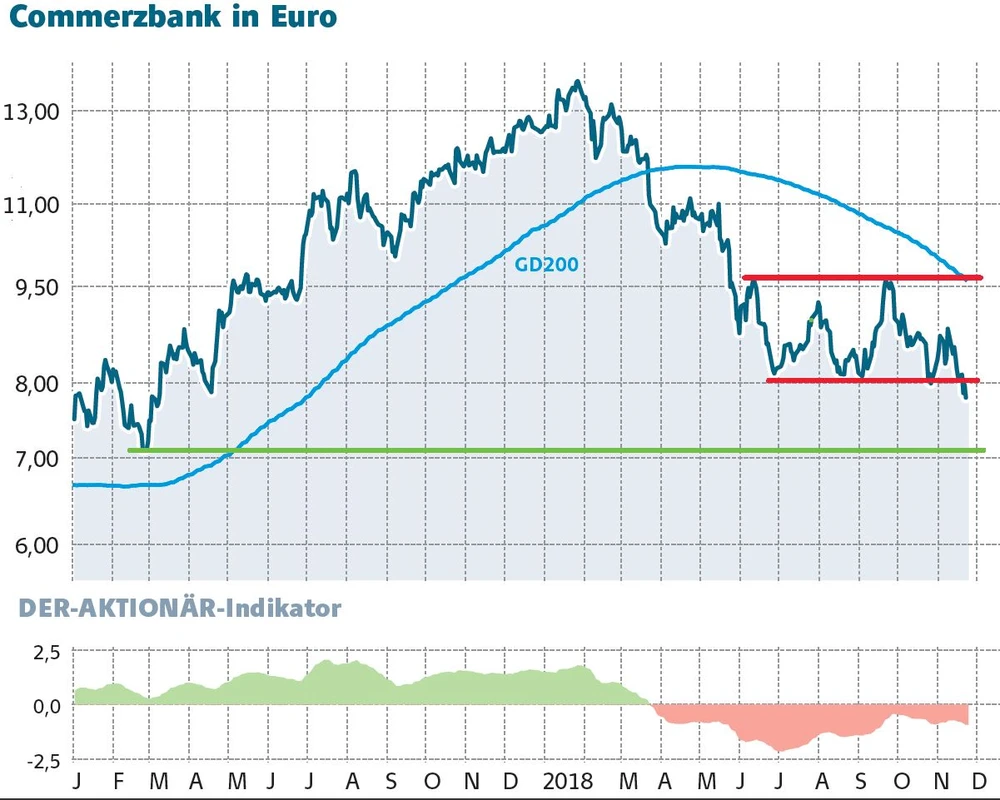 Nachdem die Commerzbank-Aktie die Unterstützungszone um die 8-Euro-Marke am Dienstag nach unten durchbrochen hat, ist der Weg Richtung 7 Euro erst einmal frei. Dort hatte die CoBank-Aktie im Februar 2017 ein Zwischentief gebildet, das nun als technische Unterstützung dienen könnte. Darunter kämen die historischen Tiefstände aus Sommer 2016 wieder in Betracht. Damals war der Kurs bis 5,50 Euro abgesackt.