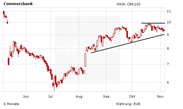 Die Commerzbank-Aktie tendierte vor den Zahlen schwächer, hatten doch viele Anleger mit schwachen Q3-Ergebnissen gerechnet. Doch die "Gelben" haben mit den heute vorgelegten Quartalszahlen überwiegend die Erwartungen der Experten übertroffen. Das operative Ergebnis fiel mit 103 Millionen Euro 40 Millionen Euro höher aus als erwartet. Das Nettoergebnis übertraf mit 77 Millionen Euro die Konsensusschätzungen um 60 Millionen Euro. Laut Commerzbank lag das vor allem an einer niedrigeren Steuerbelastung.