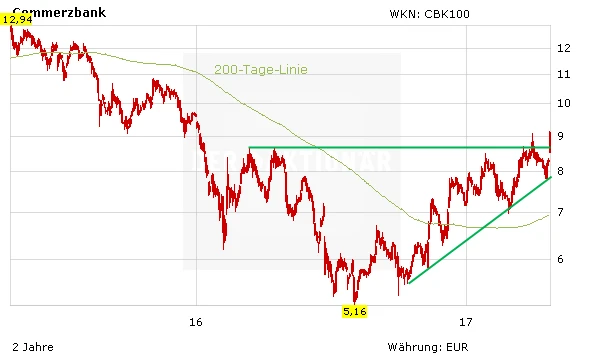 Der Kurs der Commerzbank konnte heute die Verlaufshochs aus dem Jahr 2016 bei 8,72 Euro überspringen, wodurch die Marke zu einer Unterstützung wird. Auch das jüngste Hoch bei 8,92 Euro wurde geknackt. Aus charttechnischer Sicht steht damit zweistelligen Kursen nichts mehr im Wege. Das Kursziel des AKTIONÄR von 10,70 Euro kommt in Reichweite. Anleger können weiter zugreifen bei der Aktie und sollten einen Stopp bei sieben Euro setzen.
